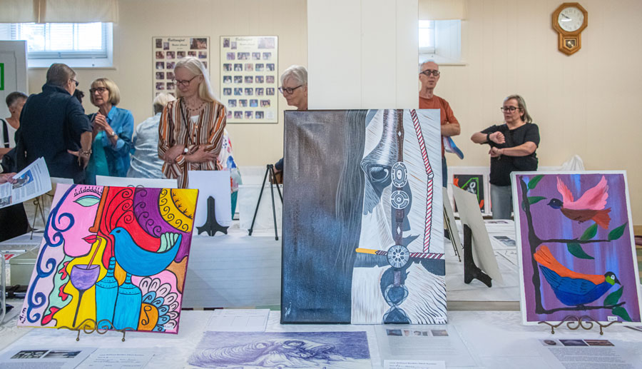 Refugee Art Exhibition founder Kayra Martinez shared stories and information while attendees admired art for sale at Erin United Church on June 7. The artists are all refugees living in Greece.