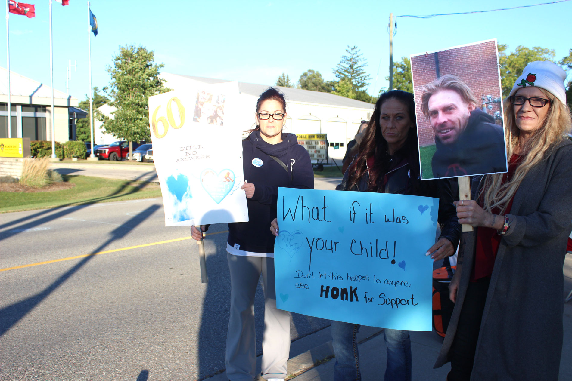 Faye Dzikewich, right, organized a peaceful protest across from the Rockwood OPP station on Sept. 8, in memory of her son Nathaniel Schofield, who died in OPP custody on July 10. The sign in the middle shows a photo of Angel Mitchell’s son, that she alleges was taken after he was “beaten” by police officers.