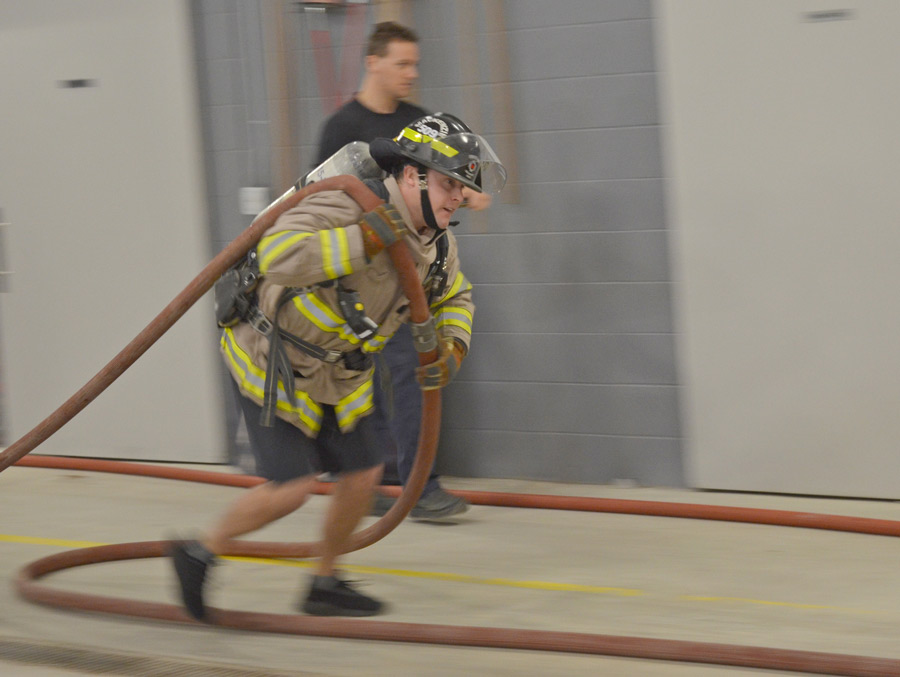 The 32 hopefuls completed a series of tasks that included dragging a 150-pound mannequin 100 feet in less than 49 seconds and hauling a fire hose charged with water the length of the fire hall.