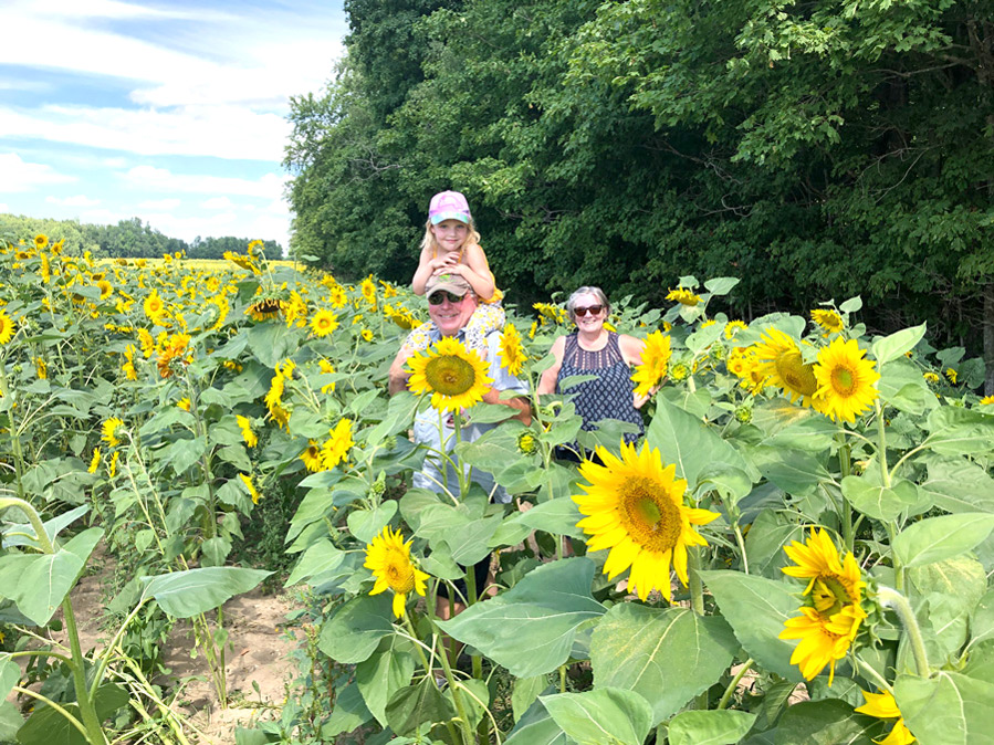 AUGUST – The Shine Your Light Sunflower Tour held on the Mapleton farm of Matt and Leona Ottens Aug. 15 and 16 raised more than $13,000 for the Canadian Cancer Society. Hugh and Judith Anne Douglas took in the tour with Annie Bijman enjoying a perfect vantage point.