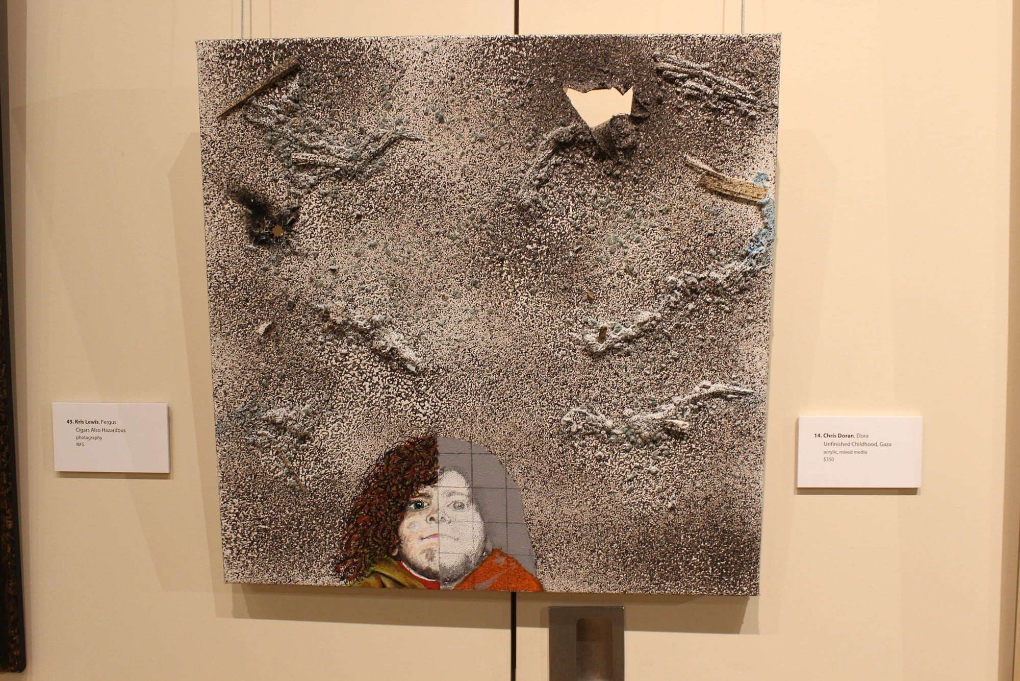Acrylic, mixed media piece entitled ‘Unfinished Childhood, Gaza’ created by Chris Doran of Elora.