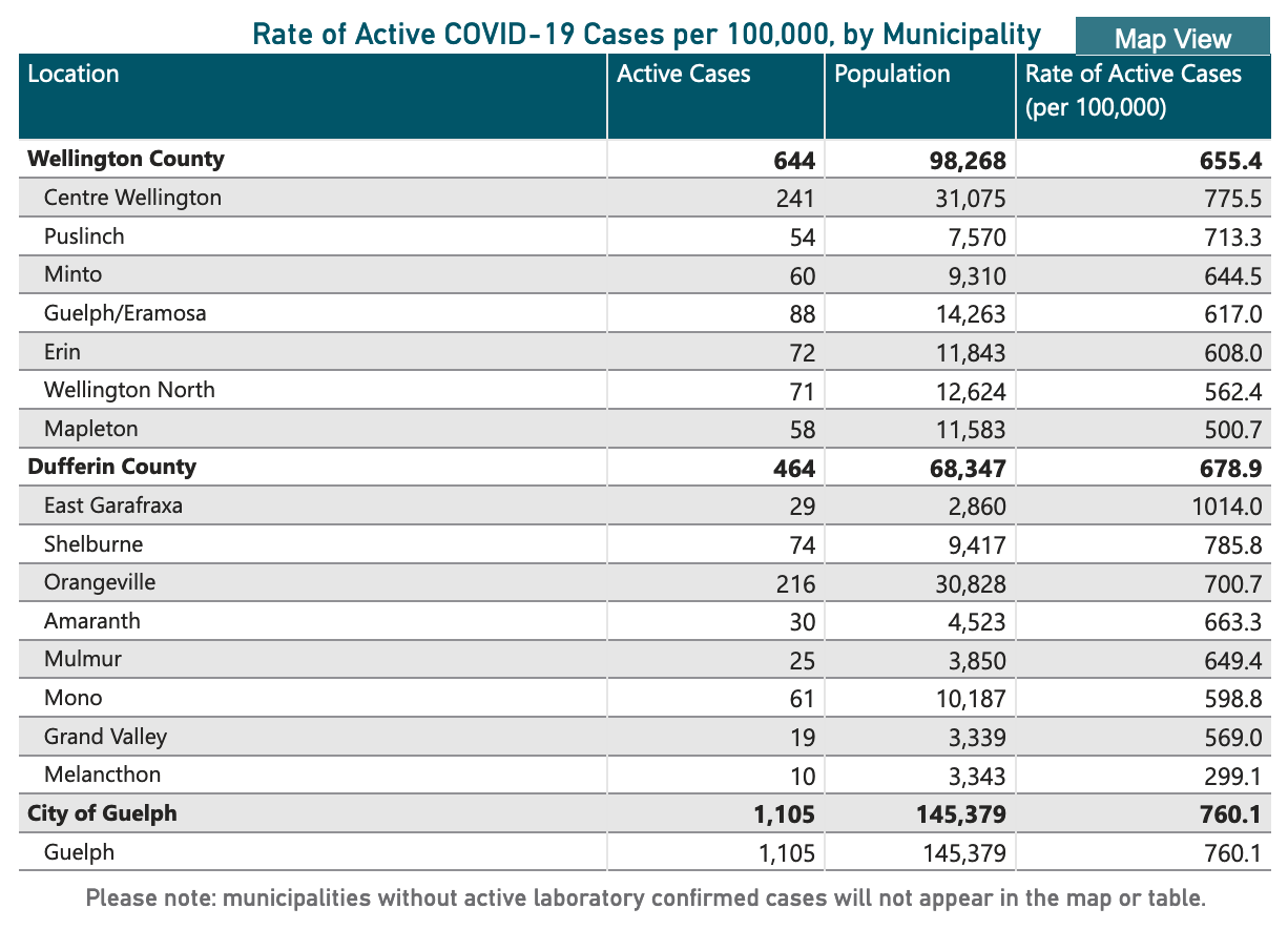 There are 1,105 active cases in Guelph and 464 in Dufferin County as of Jan. 10.