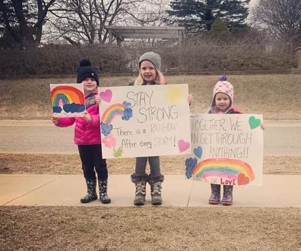 On March 26, Charleigh Johnson, Leah Hutton and Lauryn Hutton stood outside Strathcona Long Term Care in Mount Forest with signs for those stuck inside due to COVID-19 isolation requirements.