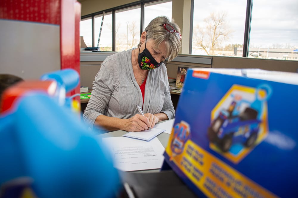 Bailey looks over a toy that a child will get to unwrap on Christmas day, thanks to a donor “adopting” a family in need of some help to put gifts under the Christmas tree this year.