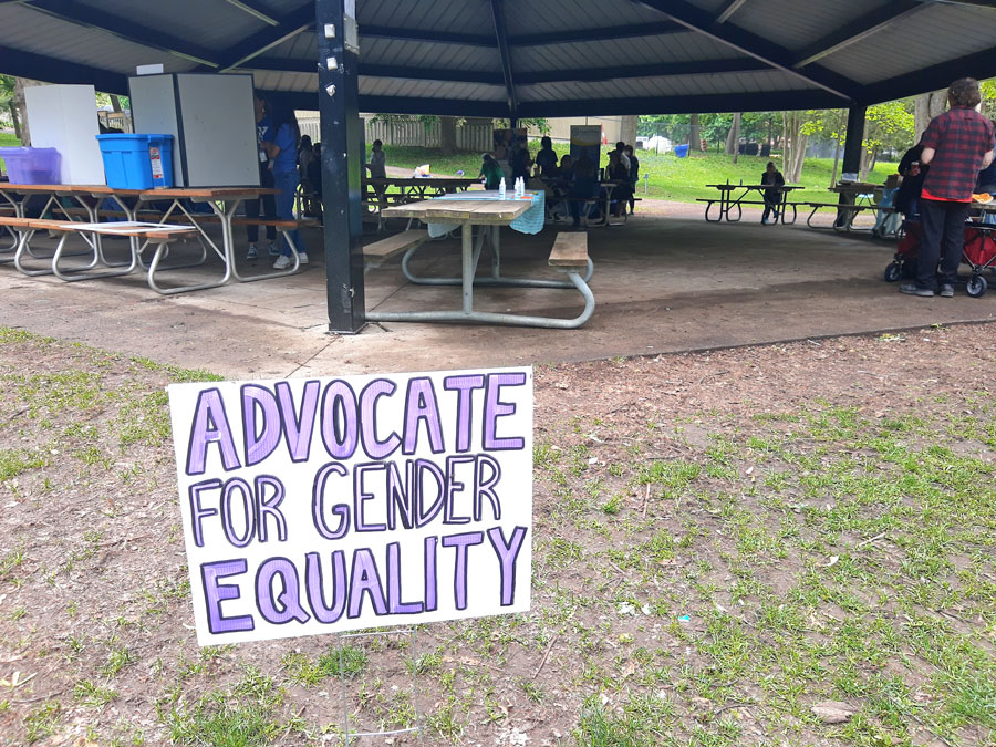 Jensen Williams, public educator for Guelph-Wellington Women in Crisis, organized the function at Riverside Park in Guelph. There were displays, activities for kids, and food for the noon-hour meeting, but no script or agenda to cover.