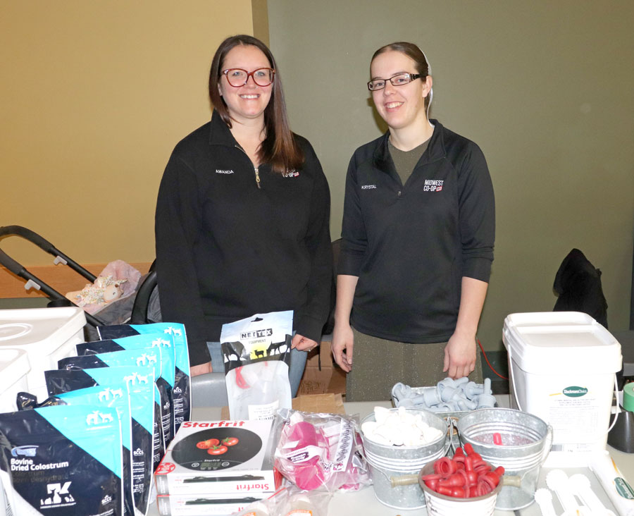 Product specialists – Amanda Burnett, left, and Krystal Lichty from Midwest Co-op were on hand to provide information on agricultural products at a booth at the Mount Forest and District Sports Complex during Sheep and Goat Day on March 11.