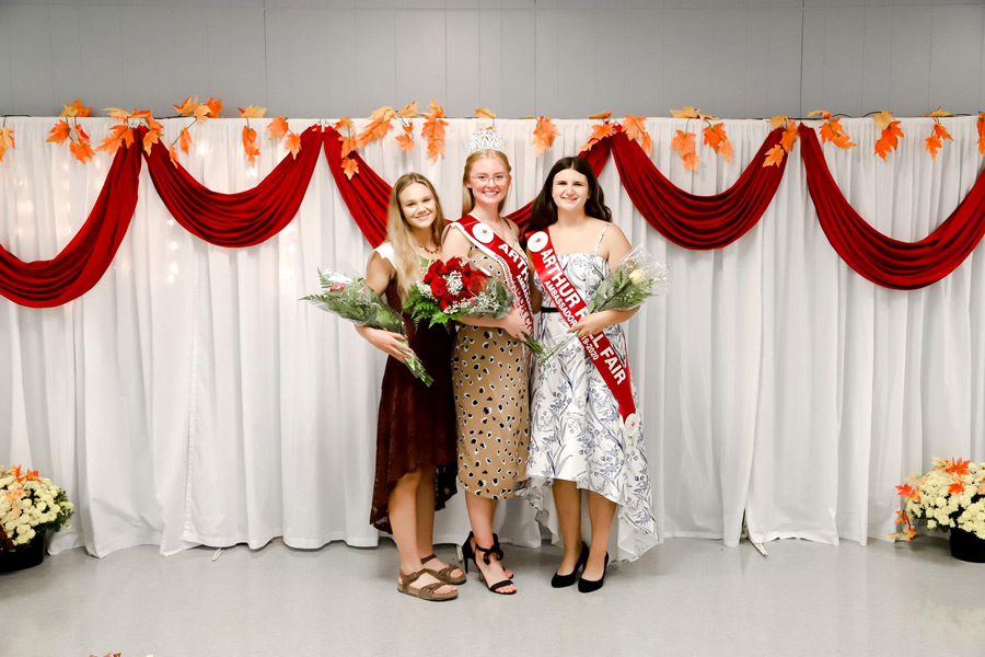 The Arthur Fall Fair held a virtual ambassador program on Sept. 10, with interviews, speeches and impromptu questions. On Sept. 12, Emma Smyth, centre, was crowned Ambassador of the Fair by Alana Wagg, right, Ambassador of the Fair 2019-2021. Runner up was Clara Wilman, left. Submitted photo