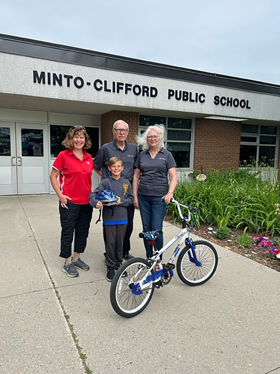 From left: Patty Mock of Harriston Home Hardware presented a new bicycle to winner Tyson MacDonald at Minto Clifford Public School, with Don and Isabel Senek.