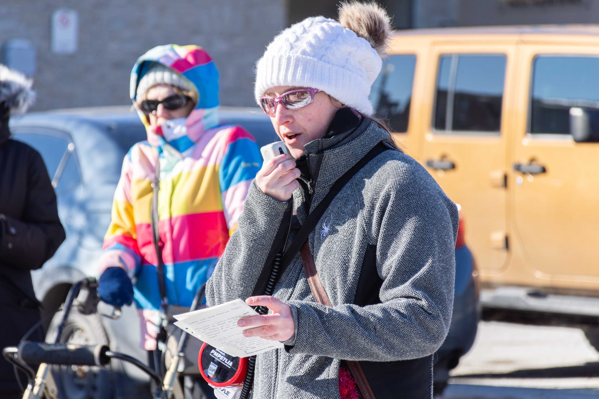 Around 20 people gathered near a sidewalk outside the office of Wellington-Halton Hills MPP Ted Arnott in the Friday afternoon cold listening to protest organizer Carolyn Mathers read from notes into a megaphone.