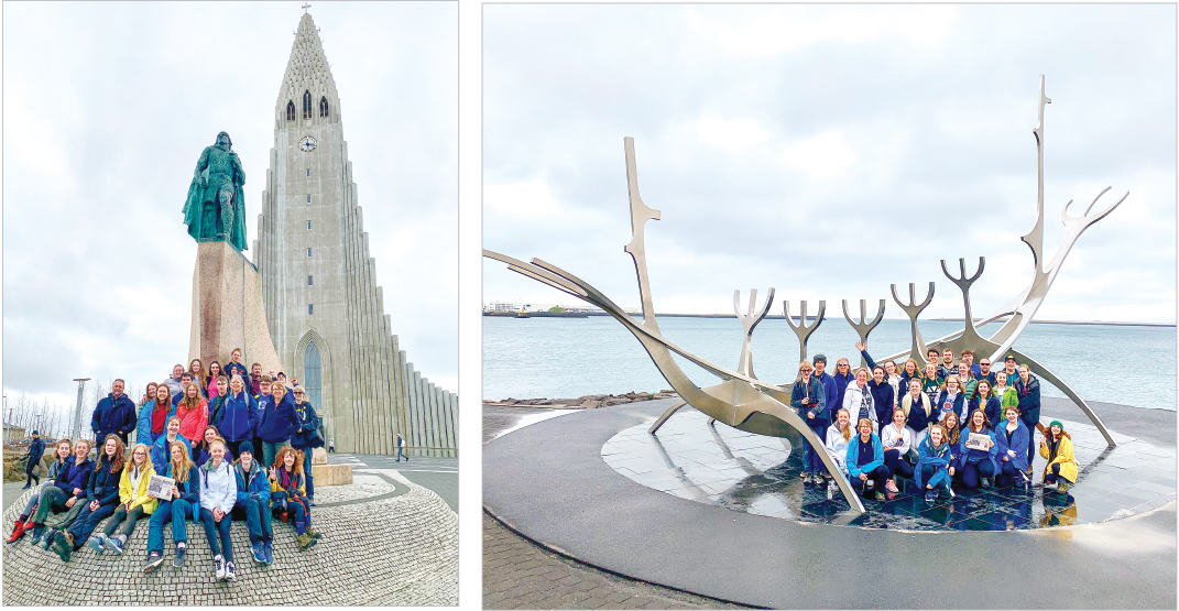 Icelandic adventure – Twenty four Centre Wellington District High School students recently travelled to Reykjavík, Iceland for a week. They were accompanied by trip coordinator Diane Ballantyne and co-supervisors Jim Mason and Dr. Tina Williams. The students saw the south coast and Golden Circle, numerous waterfalls, the Black Sand Beach, the Great Geysir (only four in the world exist), the Lava Center and the city of Reykjavík. RIGHT: The students checked out the “Solfar” or “Sun Voyager” steel sculpture on Reykjavik’s waterfront that resembles a Viking long-ship and was created by Icelandic sculptor Jon Gunnar Arnason. LEFT: Students also visited the Thor statue in front of Hallgrimskirkja (the landmark church in downtown Reykjavík). Submitted photos