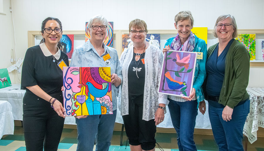 ERIN – Refugee Art Exhibition founder Kayra Martinez, left, with Erin Refugee Action Committee members Cathy Hansen, Colleen Hawes, Nora Savage and Barbara Harrison. The group had art for sale at Erin United Church on June 7.
