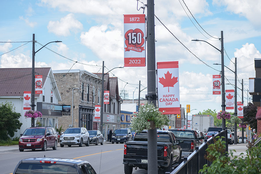 Banners and hanging flower baskets have been installed along George Street in Arthur ahead of the village’s 150th anniversary celebrations July 1 to 3. Photo by Jordan Snobelen