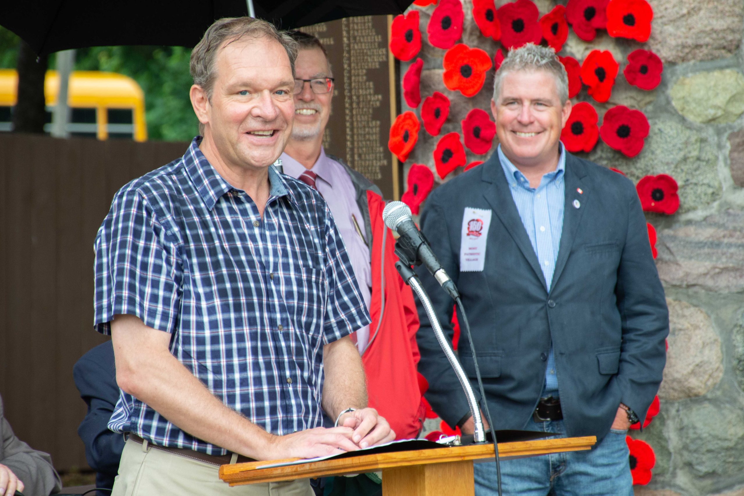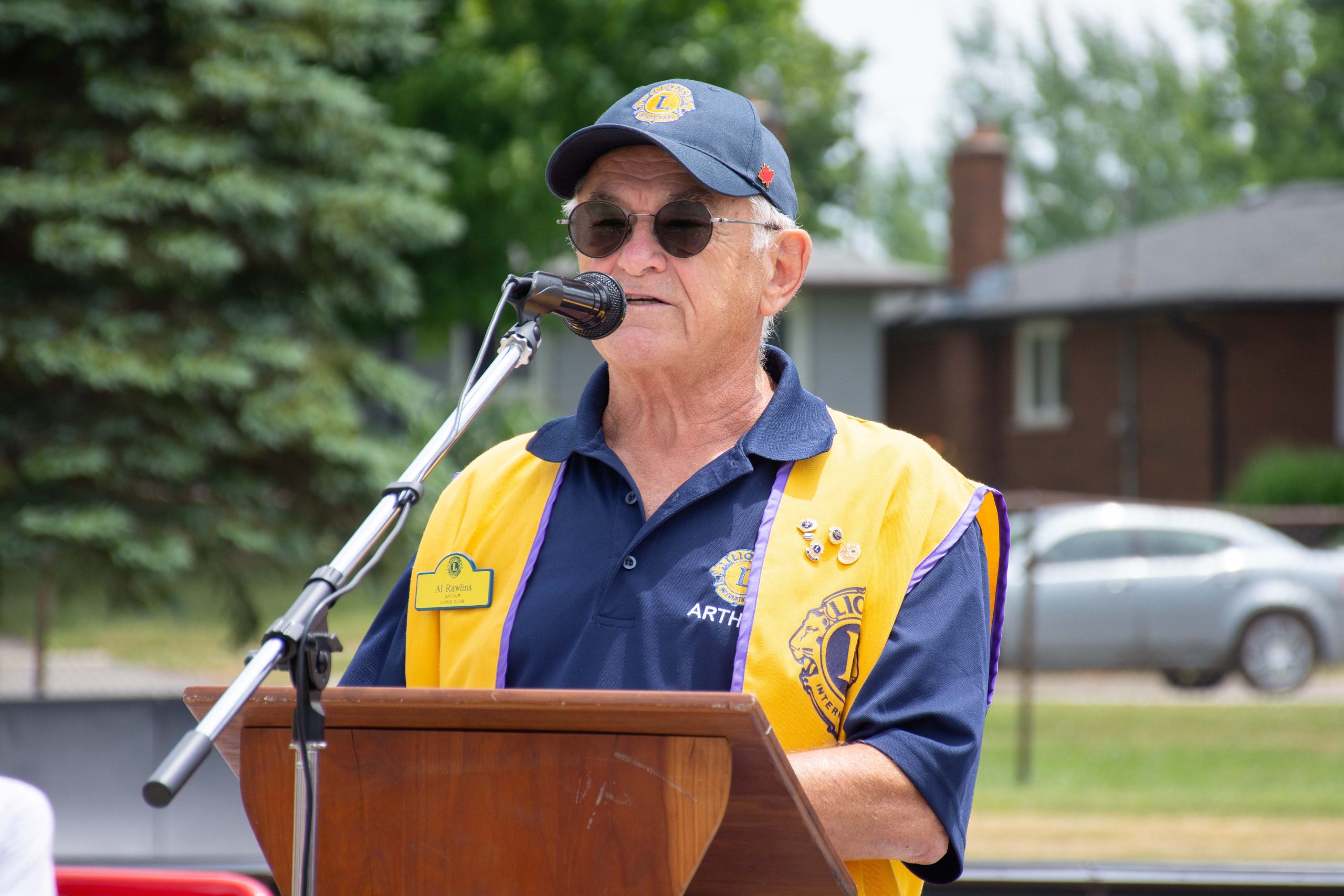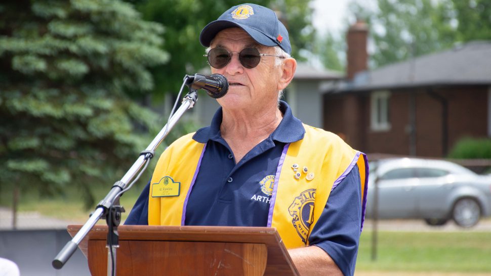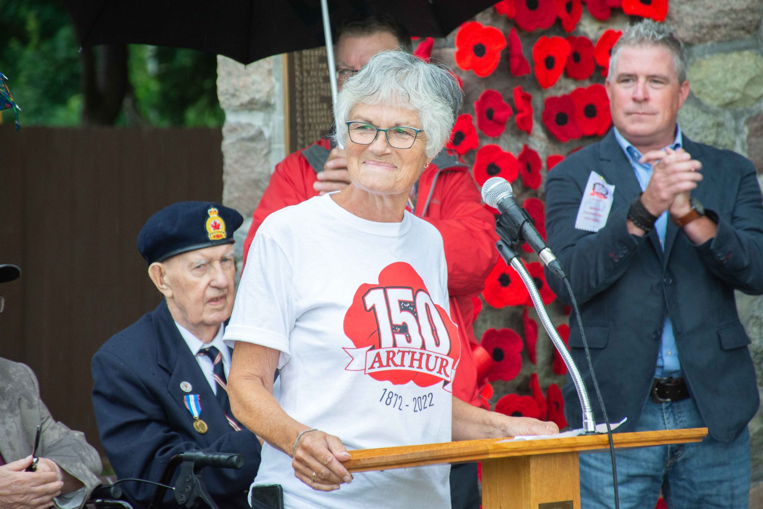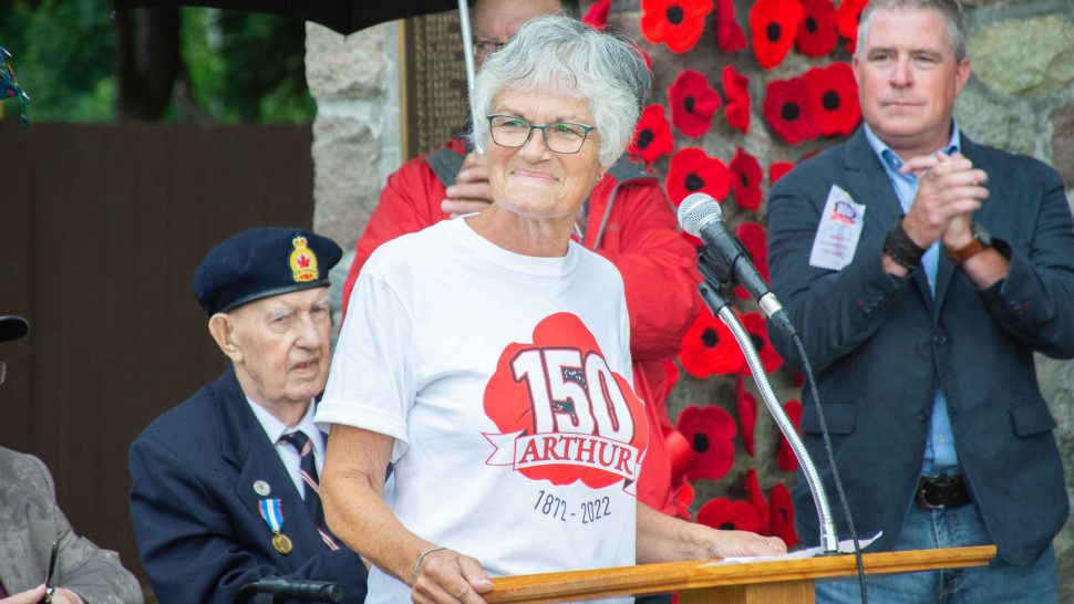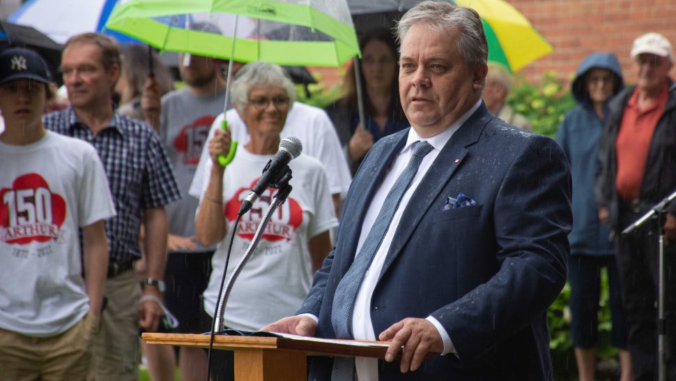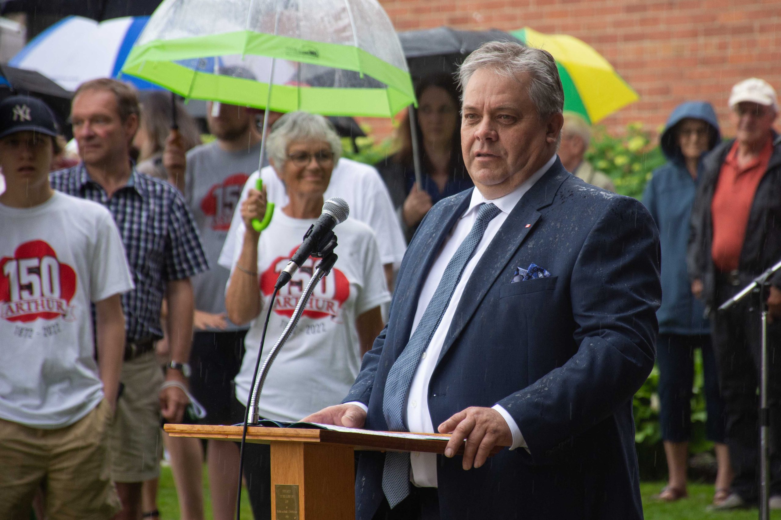Residents showed their respect Friday morning, gathering under umbrellas and taking cover under trees as local politicians and dignitaries – including Canadian Senator Rob Black, Wellington North Mayor Andy Lennox, MPPs Ted Arnott and Matthew Rae, MP John Nater, Dave Kozinets, Nancy Croft, and the Arthur 150 committee – provided remarks on the weekend celebrating 150 years since Arthur’s incorporation.