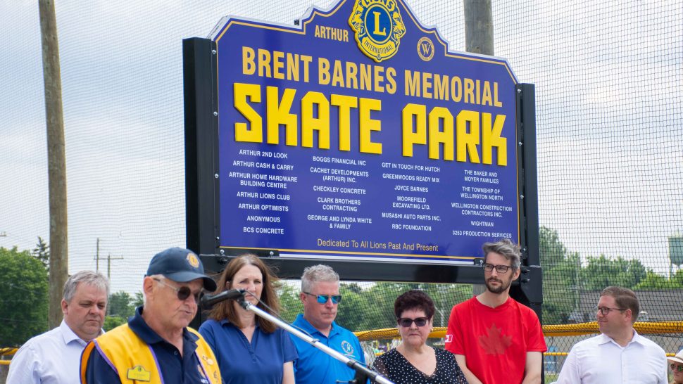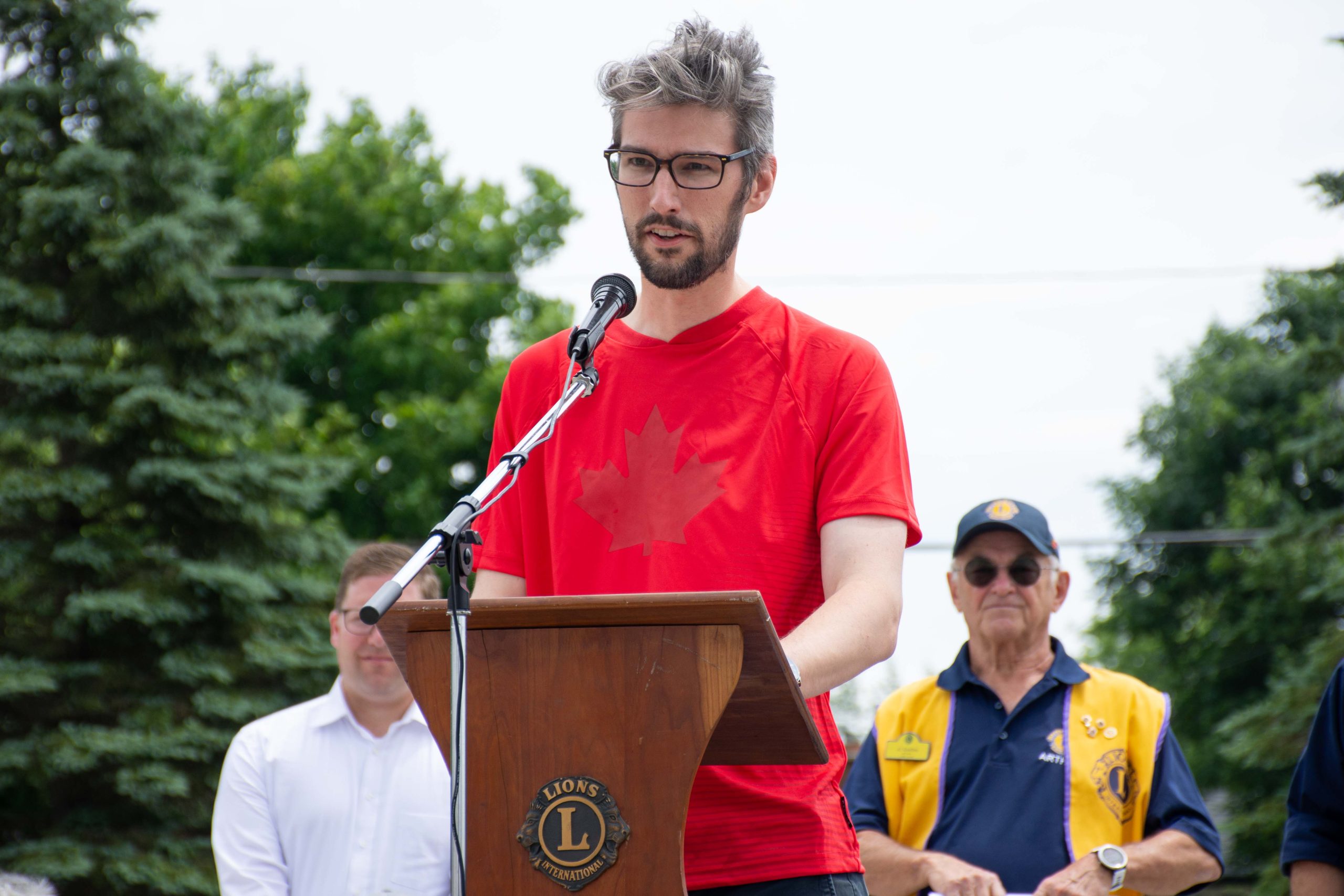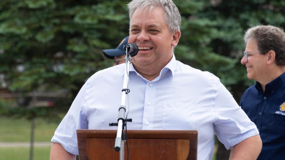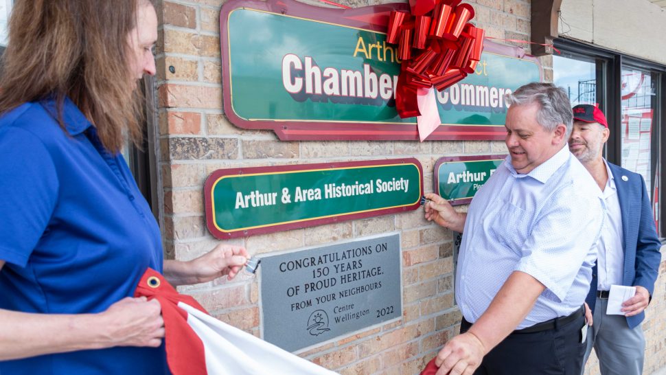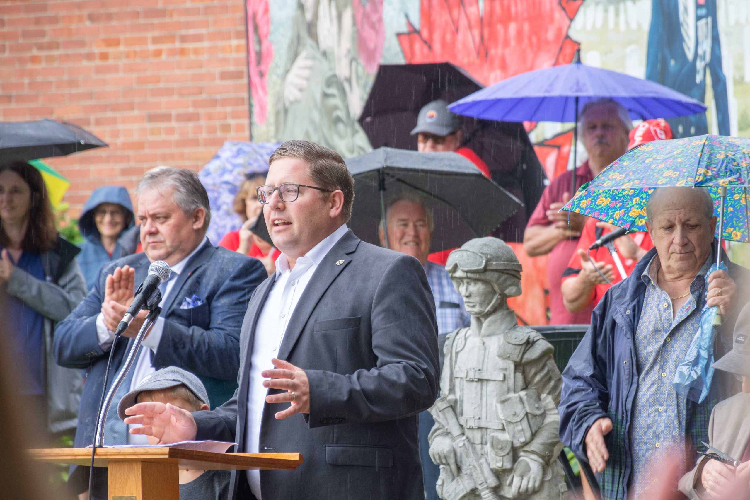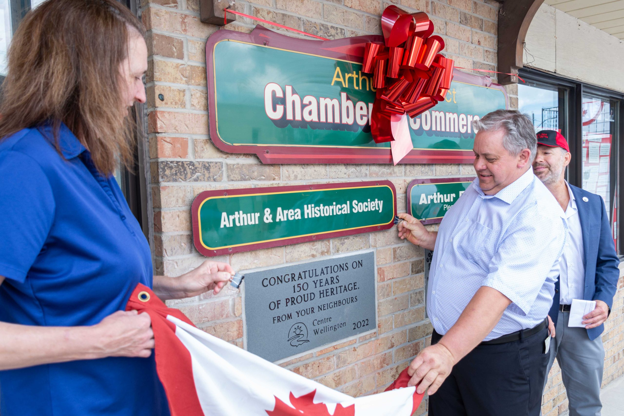 Residents showed their respect Friday morning, gathering under umbrellas and taking cover under trees as local politicians and dignitaries – including Canadian Senator Rob Black, Wellington North Mayor Andy Lennox, MPPs Ted Arnott and Matthew Rae, MP John Nater, Dave Kozinets, Nancy Croft, and the Arthur 150 committee – provided remarks on the weekend celebrating 150 years since Arthur’s incorporation.