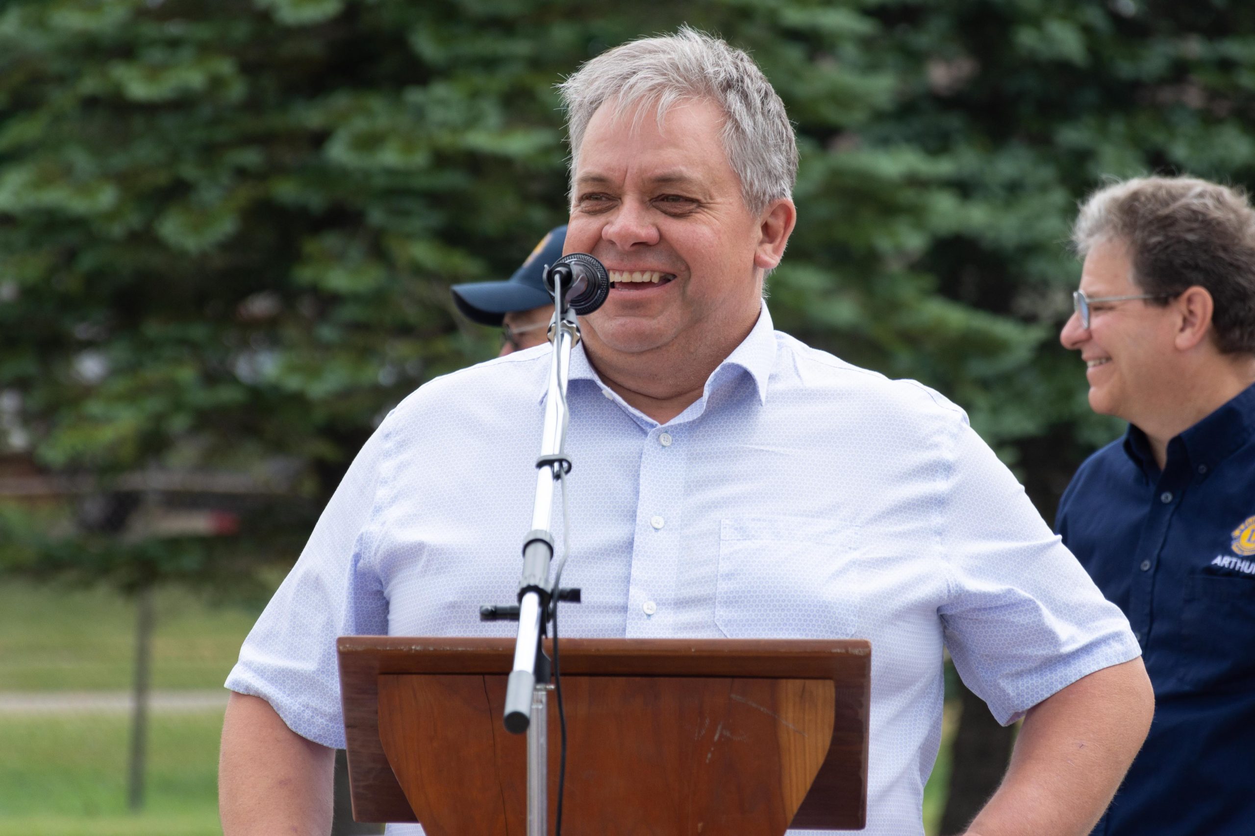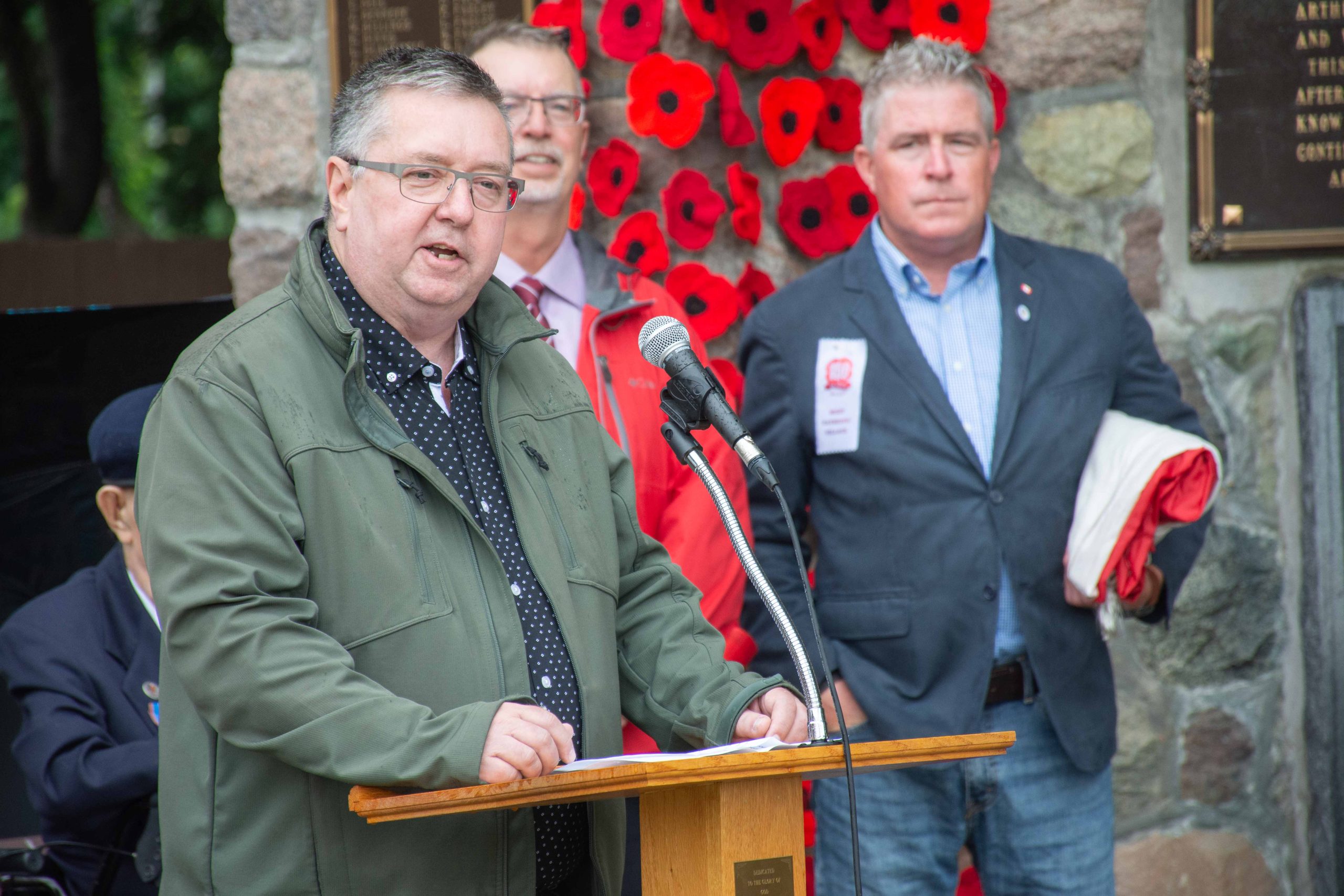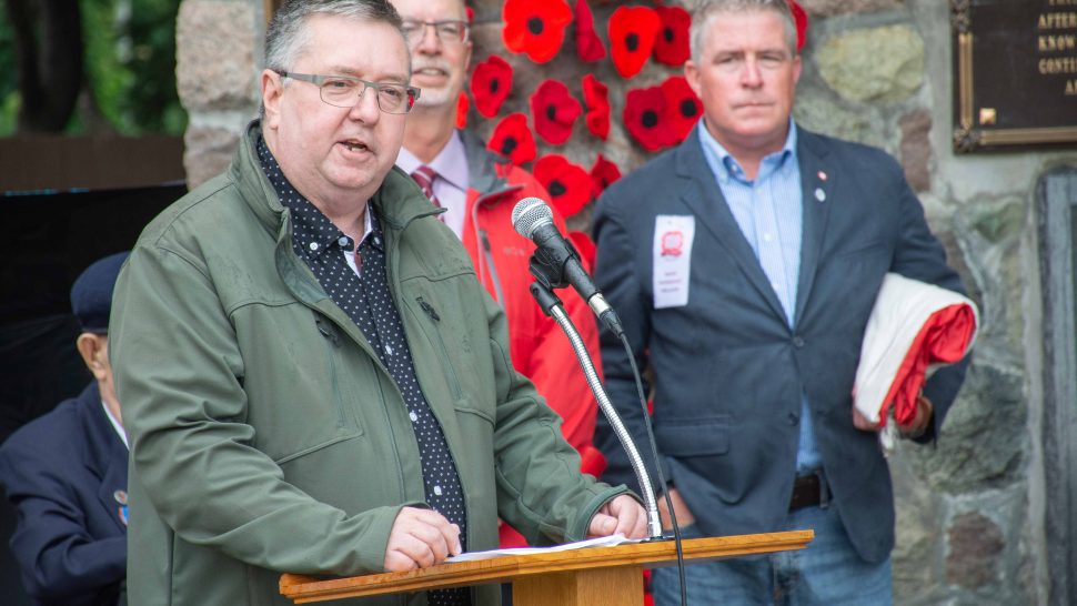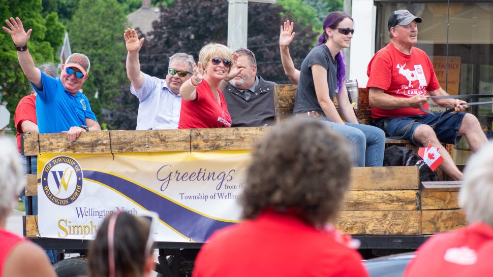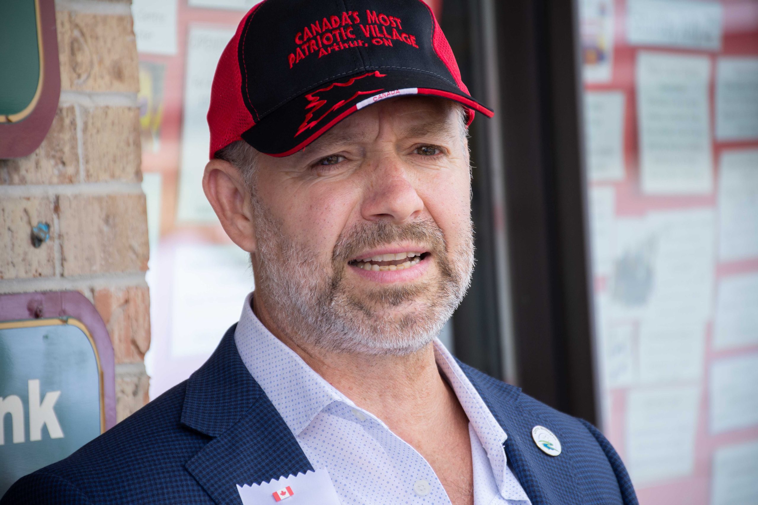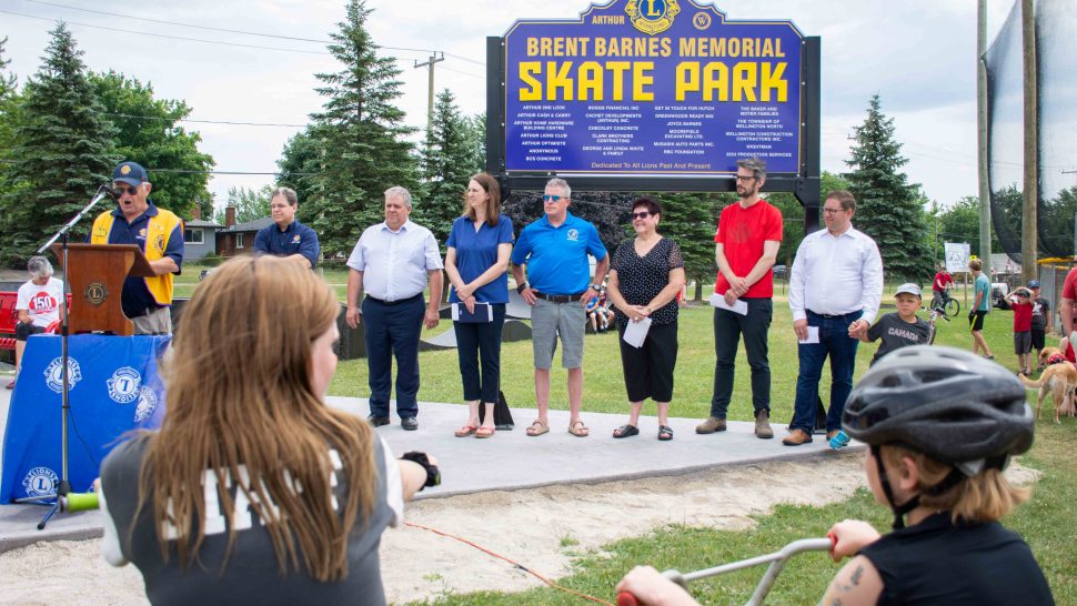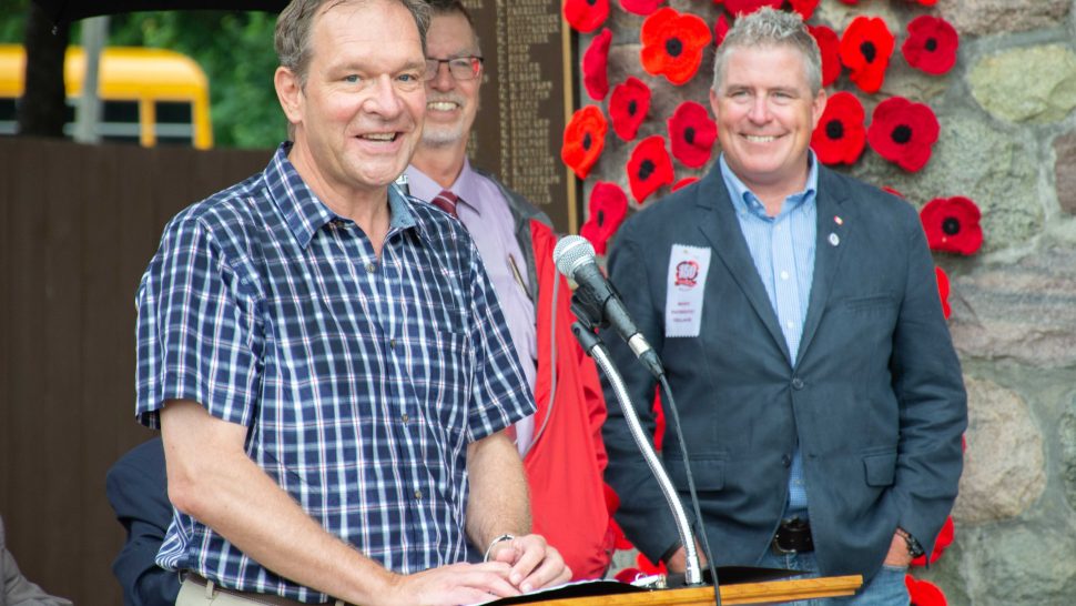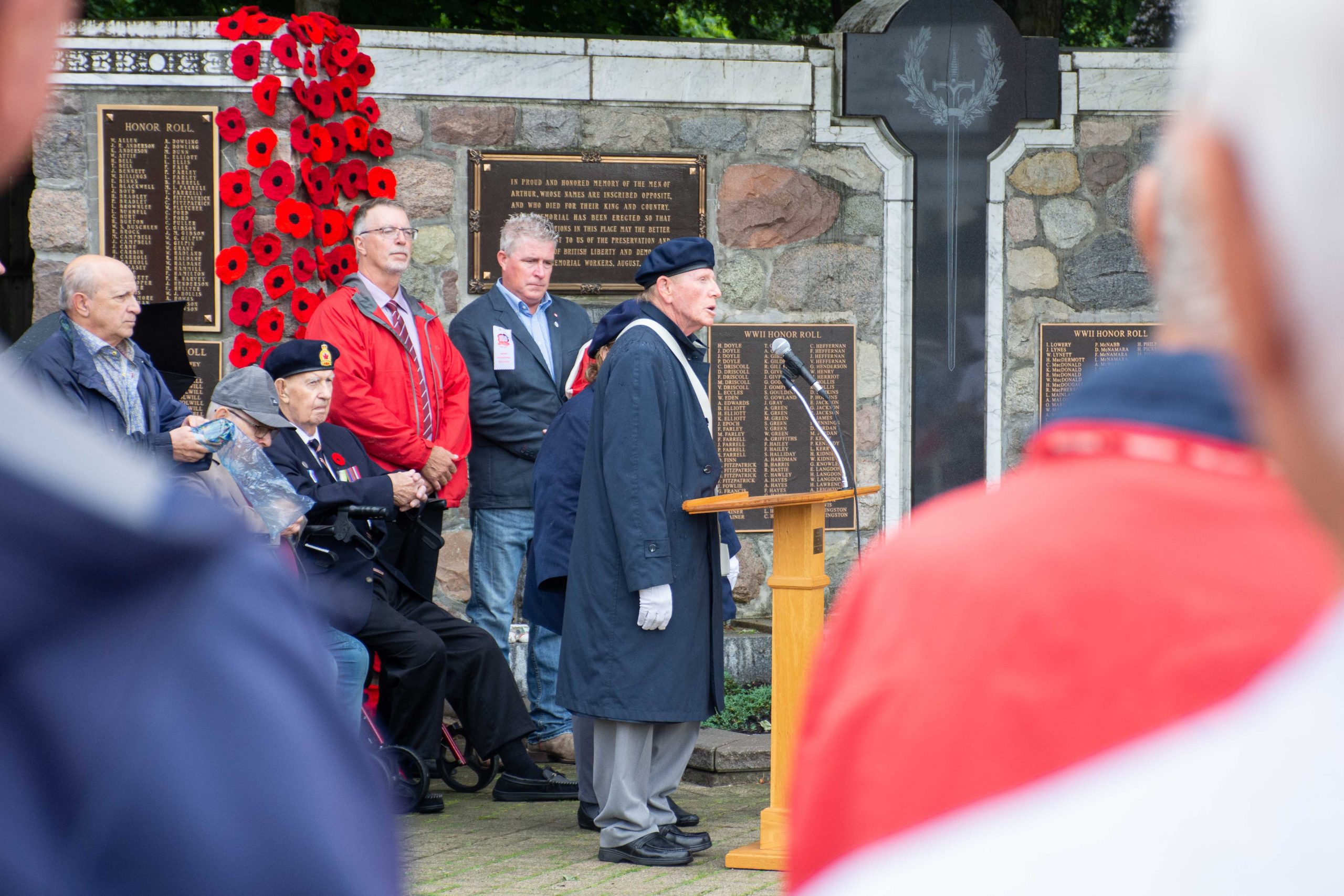 Residents showed their respect Friday morning, gathering under umbrellas and taking cover under trees as local politicians and dignitaries – including Canadian Senator Rob Black, Wellington North Mayor Andy Lennox, MPPs Ted Arnott and Matthew Rae, MP John Nater, Dave Kozinets, Nancy Croft, and the Arthur 150 committee – provided remarks on the weekend celebrating 150 years since Arthur’s incorporation.