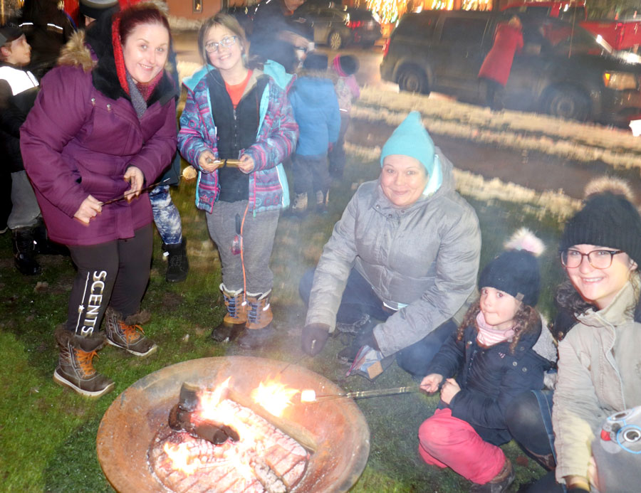 All fired up – There were no chestnuts to roast over an open fire, but there were plenty of marshmallows at Arthur’s third annual Christmas tree lighting last Friday night.  From left: Erin and Rhya Brisson-Coish, Jen McCollogh, and Skye and Lisa Johnson enjoy the fire while waiting for the Christmas tree lighting.  Arthur’s fire fighters were on hand to keep things safe, while festive music provided by Derek Moore kept spirits high.