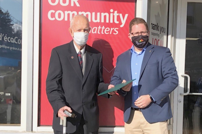 In 2020 Perth-Wellington MP John Nater, right, presented John Walsh with a commemorative lapel pin and certificate of recognition created to honour the 75th anniversary of the Allied victory in the Second World War. Advertiser file photo