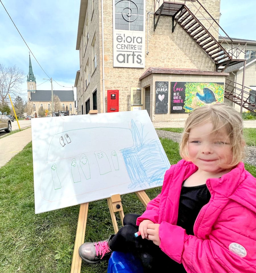 Young plein-air artist, Mae Lee, 5, of Elora, creates her interpretation of Knox Presbyterian Church using materials purchased at the sale.