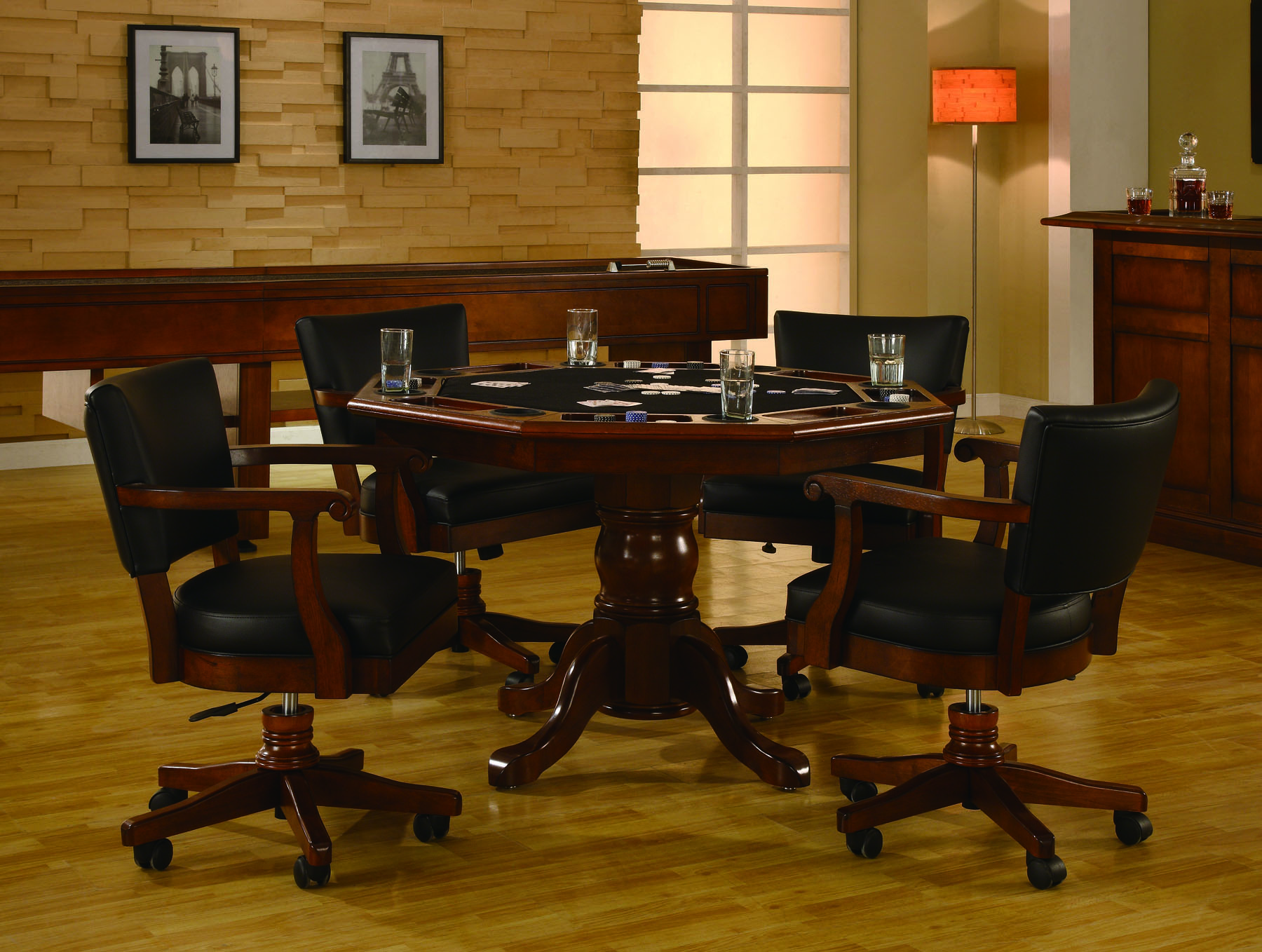What else might complement your personal getaway space? How about some card tables? Poker-nights have long been a fun way of spending time with friends and family. Associated Billiards has a fabulous selection of gaming tables, specifically designed to host card games, and they also have the chairs to match. Perfect! A traditional pub table and stools might also add a nice authentic touch to a corner of your fun space as well.