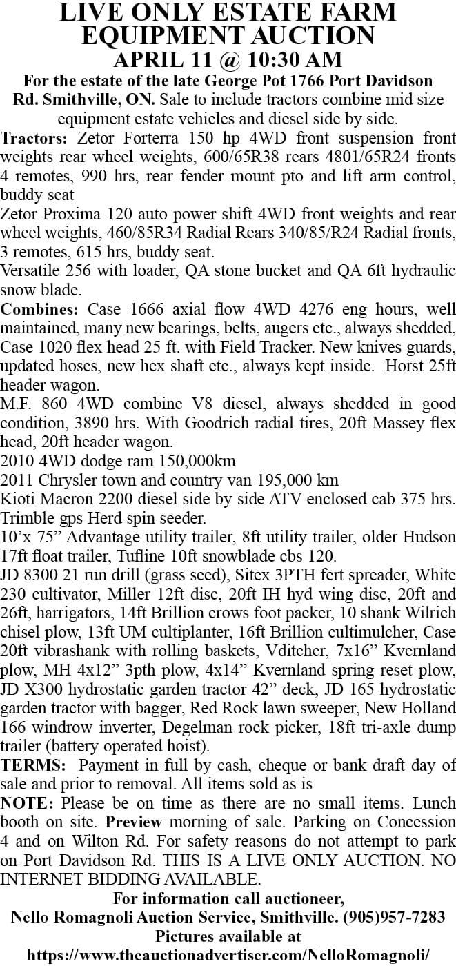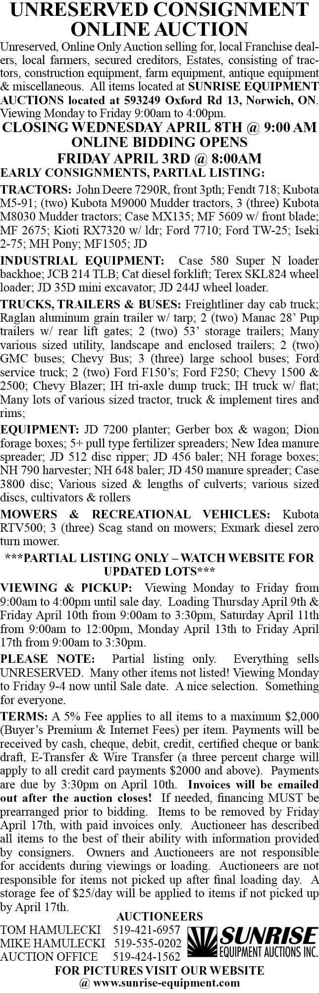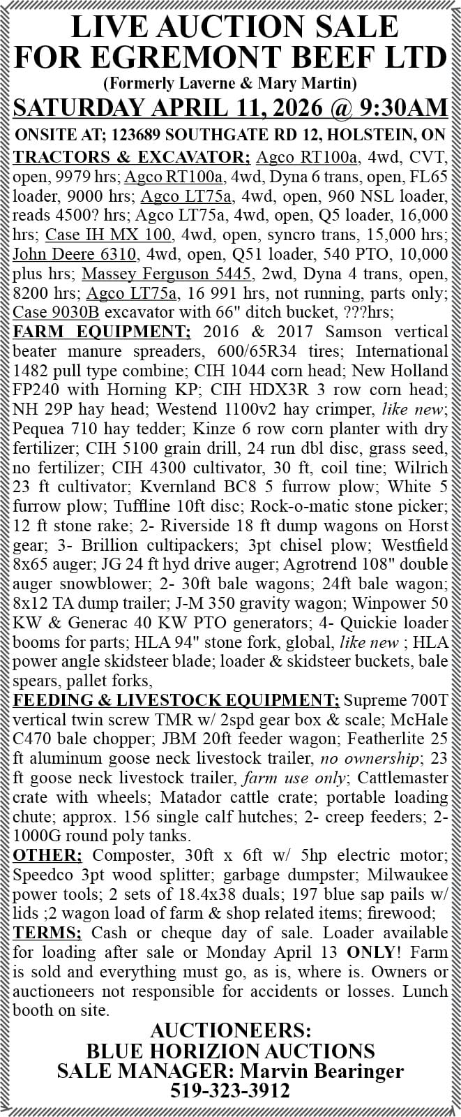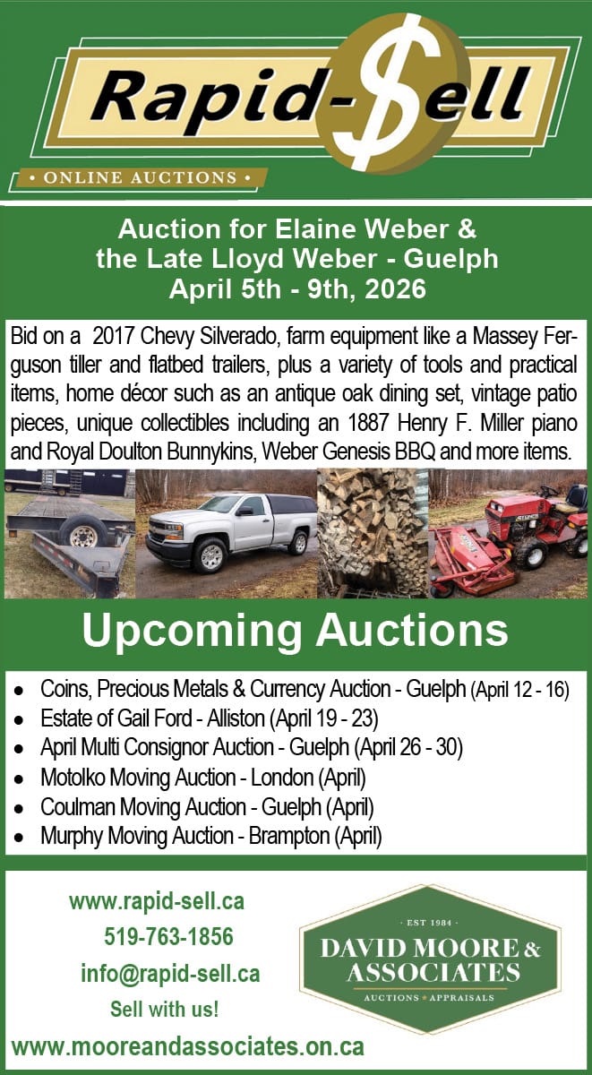 Auction Auctions this week in Wellington County Publication Date: April 2, 2026 by Wellington Advertiser Link copied! Copy failed! Published: January 16, 2026 at 12:00 PM Updated: April 01, 2026 at 11:24 AM This Week's Auction ListingsWellington Advertiser Auction Directory by Wellington Advertiser Link copied! Copy failed! Published: January 16, 2026 at 12:00 PM Updated: April 01, 2026 at 11:24 AM