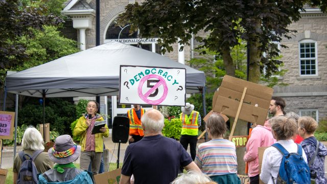ELORA – Community members and activists gathered at MacDonald Square in Elora on Aug. 23 to voice their opposition to the province’s Bill 5, dubbed the Protect Ontario by Unleashing Our Economy Act.