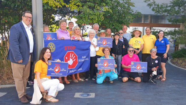 GUELPH – Members of the Rotary Club of Guelph South converged on city hall on July 29 to raise a flag and raise awareness about human sex trafficking.