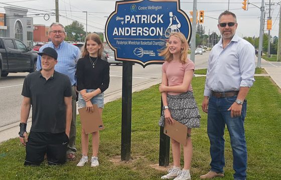 FERGUS – Fergus native and wheelchair basketball star Patrick Anderson came to town on May 20 to unveil a sign that was put up in his honour. The idea for the sign was prompted by three Elora Public School students.