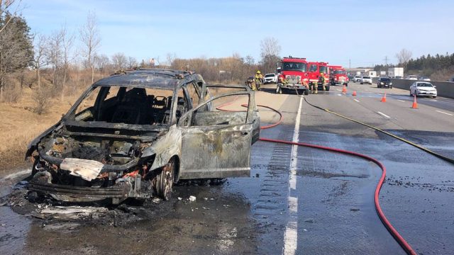 PUSLINCH – The Puslinch fire department responded to a 911 call from a car on Highway 401 on Sunday afternoon and arrived to find the car fully in flames.