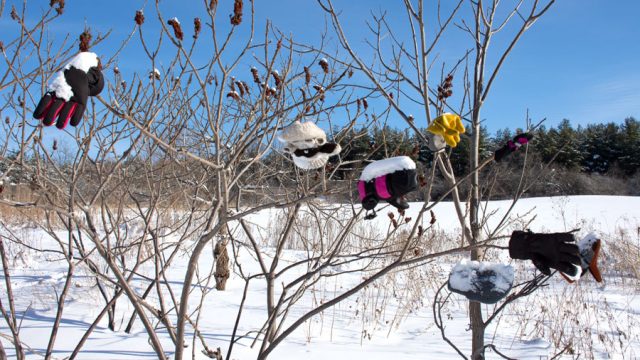 Mitten tree on Starky’s Hill trail a lost and found for the season