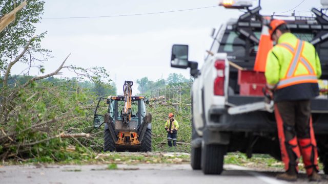 Weather damage – Wellington County roads workers clear felled trees from Wellington Road 26, west…