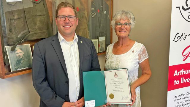 ARTHUR – Faye Craig was presented with a Queen’s Platinum Jubilee pin at the Arthur and Area Historical Society meeting on Aug. 17, by Perth-Wellington MP John Nater.