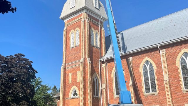 Reaching the heights – Work to secure panels and seal windows on the steeple at Knox Calvin…