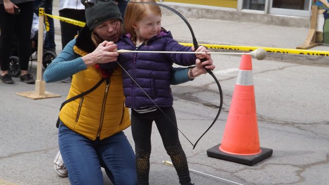 Mikenna O’Sullivan, 4, of Fergus, gets some help with her archery skills from Heather Elsley…