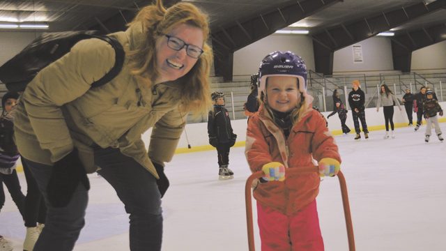 Anneliesse Hill, 3, and her mom Tine were among the large turnout of skaters at Centre 2000 in Erin…