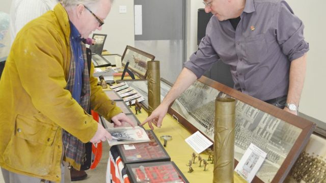 War artifacts – Guelph-Eramosa Mayor Chris White, left, checks out the First World War memorabilia display from the personal collection of Erin county councillor Jeff Duncan, right, at the Wellington County Historical Society meeting.