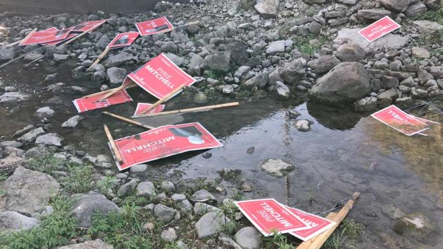 Elections Canada and three police forces are investigating after more than 100 election signs for Perth-Wellington Liberal candidate Pirie Mitchell appear to have been methodically stolen.