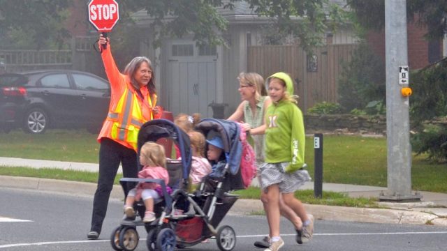 Back they go - Crossing guard Pam Baker escorts Upper Grand school trustee Jen Edwards and a group of children across Main Street in Erin on the first day of the new school year.