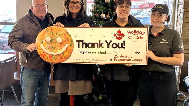 MOUNT FOREST – Earlier this month, the Mount Forest Tim Hortons restaurant presented a cheque to the Louise Marshall Hospital Foundation (LMHF) from the proceeds of its recent Holiday Smile Cookie Campaign.
