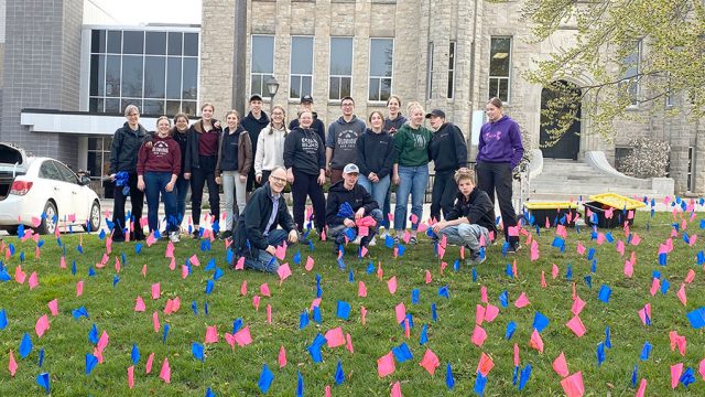School display – Students in the political club at Emmanuel Christian High School placed hundreds of pink and blue flags on the lawn in front of the Fergus school on May 10.