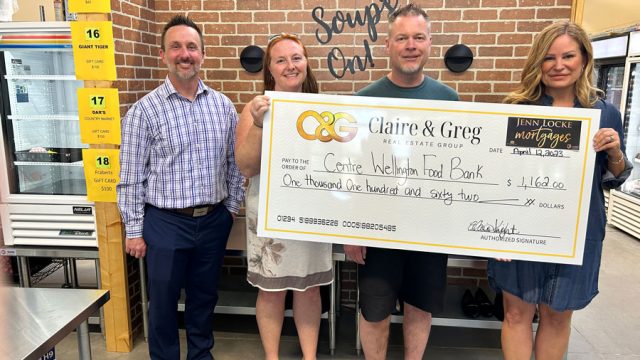 Donation – Claire and Greg Real Estate Group and Jenn Locke Mortgages, with the help of Centre Wellington businesses and the community, raised $1,162 plus multiple bags of food for the Centre Wellington Food Bank with the #CWGolden Egg Event again this year.