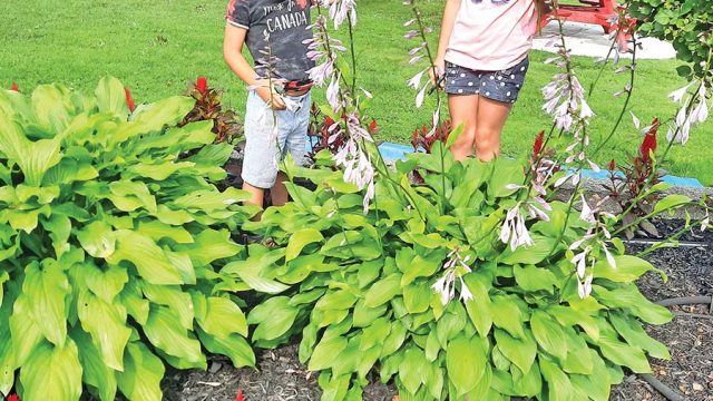 Junior gardeners – Braxton and Cloe Bott tend to the flowerbed at the Arthur Cenotaph on July…