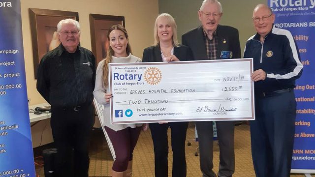 Canada Day donation - The Fergus-Elora Rotary Club presented a cheque for $2,000 to the Groves Hospital Foundation from the club’s Canada Day event at the Fergus sportsplex.