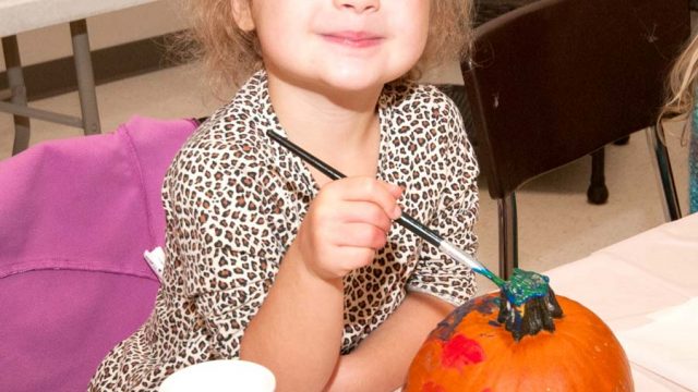 Pumpkin painting – Hailey Anderl paints a pumpkin at the 2019 Harvest Festival at the…