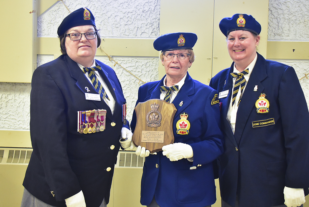 At the District C3 annual conference held this year at the Elora Canadian Legion Branch 229 the Ladies Auxiliary of the branch celebrated its 80th anniversary on April 28. About 75 ladies attended to hear what is being planned for the auxiliary in the coming years from keynote speaker and immediate past president of Ontario Provincial Command Ladies Auxiliary Kim Adams from Hailibury. Wellington-Halton Hills MPP Ted Arnott and Centre Wellington Mayor Kelly Linton attended to offer their congratulations. Current president Sharon Green, centre, accepted the congratulatory plaque from Adams, left, and zone commander for Ladies Auxiliary C3 Joyce McLean of Mount Forest. Photo by Bill Longshaw