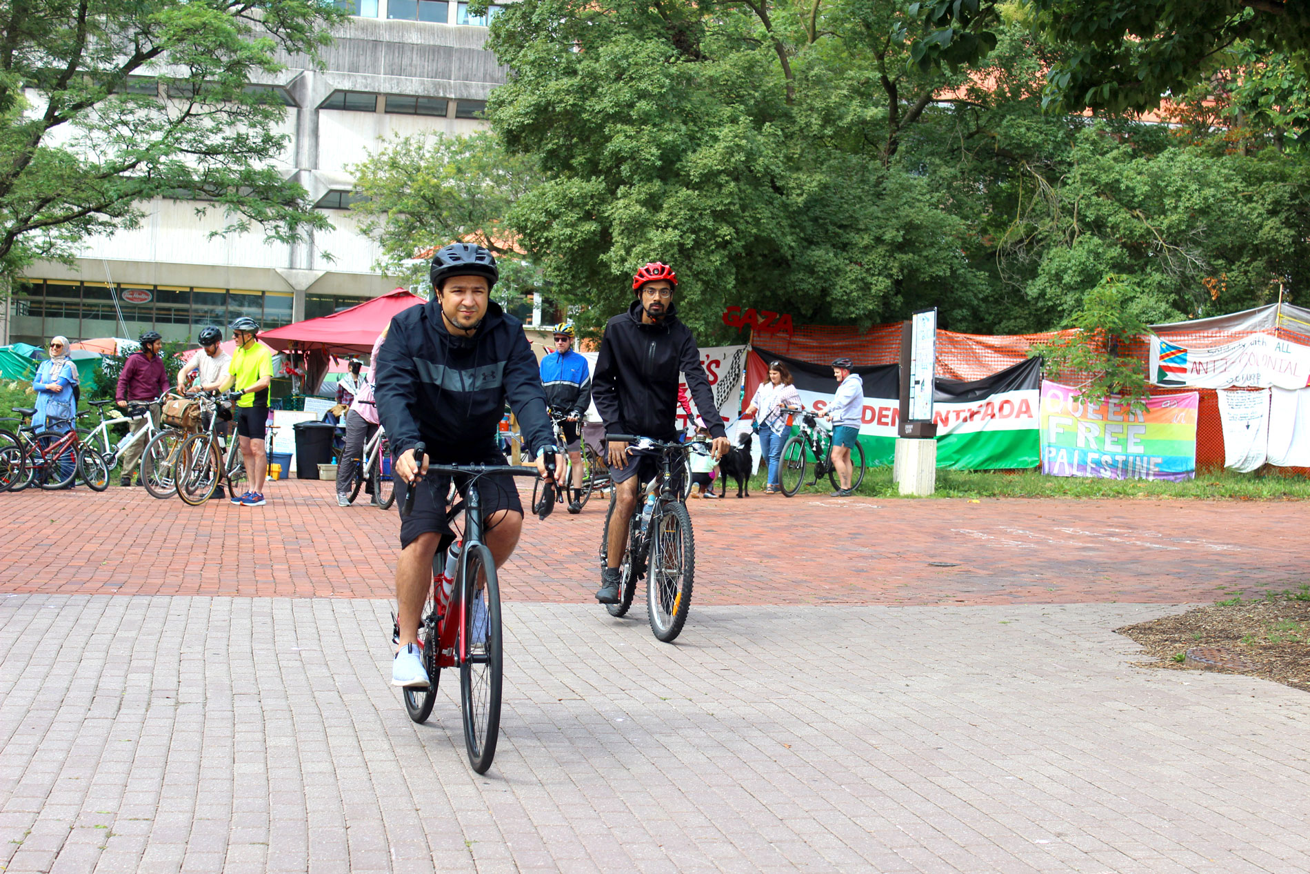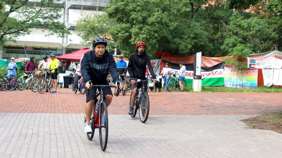 The ride started and ended at the university, where students have set up an encampment they call the “People’s Plaza for Palestine.”