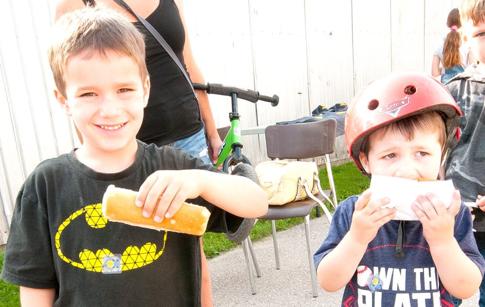 Bike rodeo - The Optimist Club Of Moorefield held its annual bike rodeo on Aug. 28 with almost 40 cyclists on hand. The rodeo was followed by a hotdog lunch and presentation of trophies for category winners and prizes for all participants. Organizers thanked C. Deen Electric for sponsoring the prizes and OPP Constable Campbell for assistance with the event. TOP: Rodeo winners, from left, were: Seth Ottens, Huck Bates, E.J. Kopf, Christine Grasman, Rachel Grasman and Karissa Poechman. BELOW: Brayden and Kaylan Saunders enjoying their well earned hot dogs. Micah Morgan practicing his skills on the course. Photos by Jennifer Goertzen