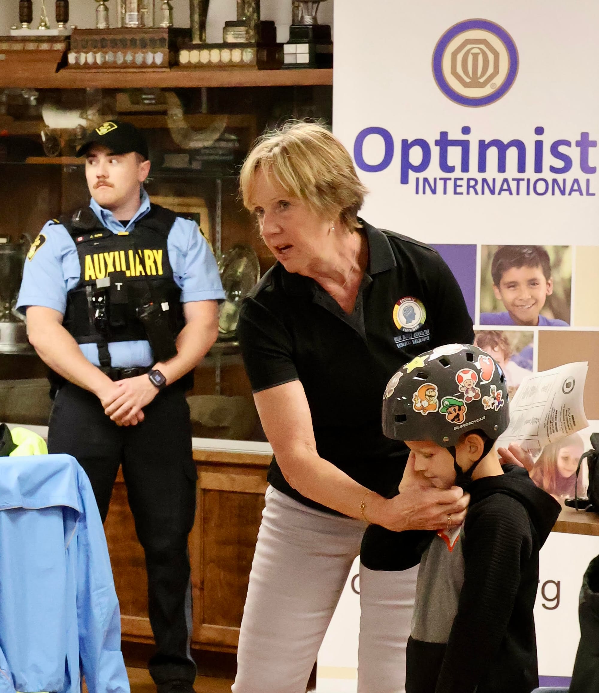 A full house of young cyclists learned about helmet fitting, correct signalling and much more. Steady rain forced participants inside the rink for the practical session where they practiced their skills on a specially designed course. Jodi Murray of the Waterloo Wellington Brain Injury Association instructs the young cyclists about the importance of wearing a helmet correctly.
