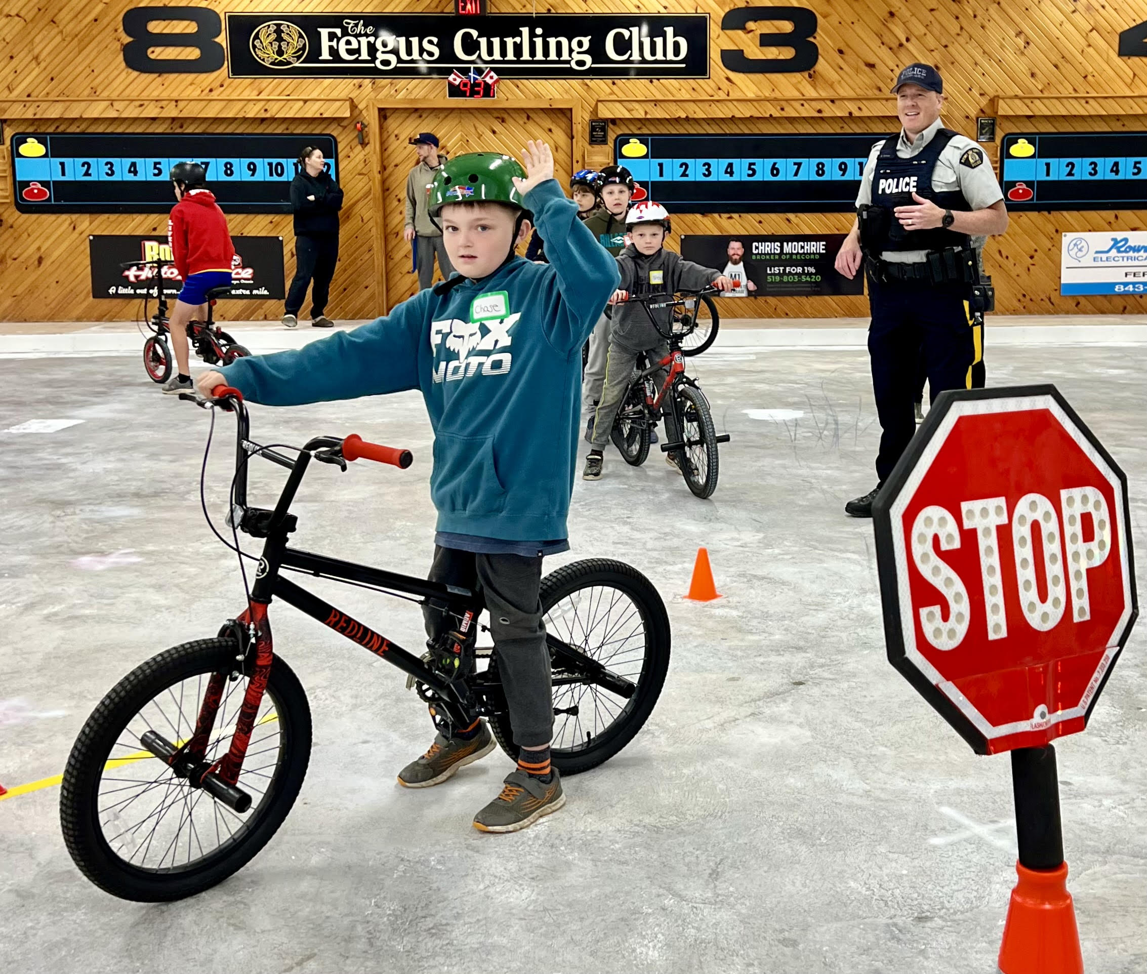 A full house of young cyclists learned about helmet fitting, correct signalling and much more. Steady rain forced participants inside the rink for the practical session where they practiced their skills on a specially designed course. Jodi Murray of the Waterloo Wellington Brain Injury Association instructs the young cyclists about the importance of wearing a helmet correctly.