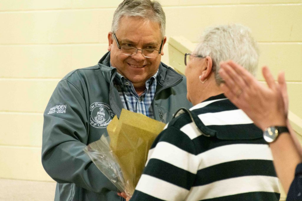 Wellington North Mayor Andy Lennox congratulates the township’s 2023 Senior of the Year award recipient. (Photo by Jordan Snobelen)