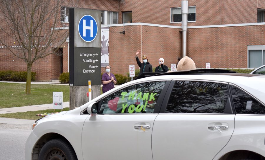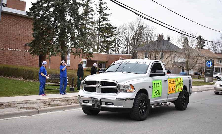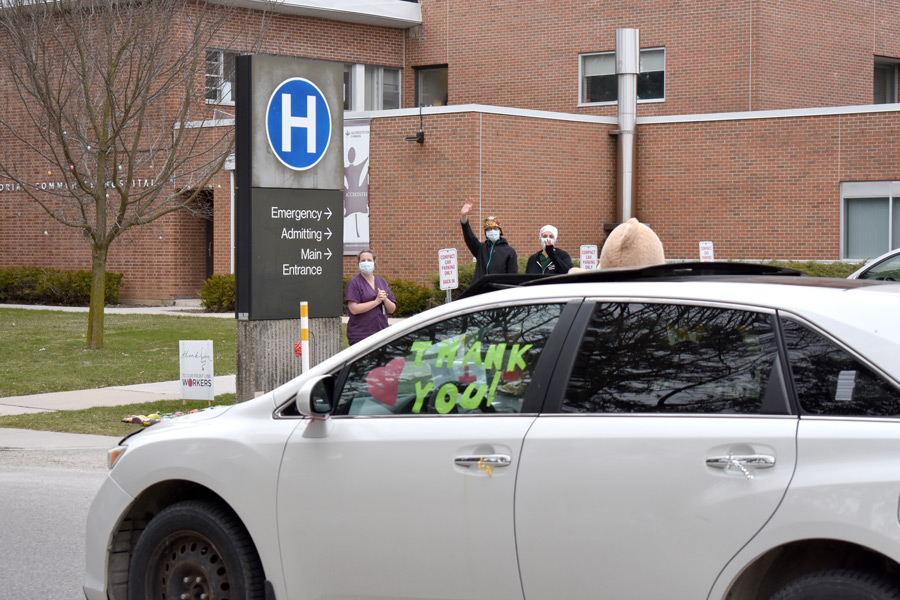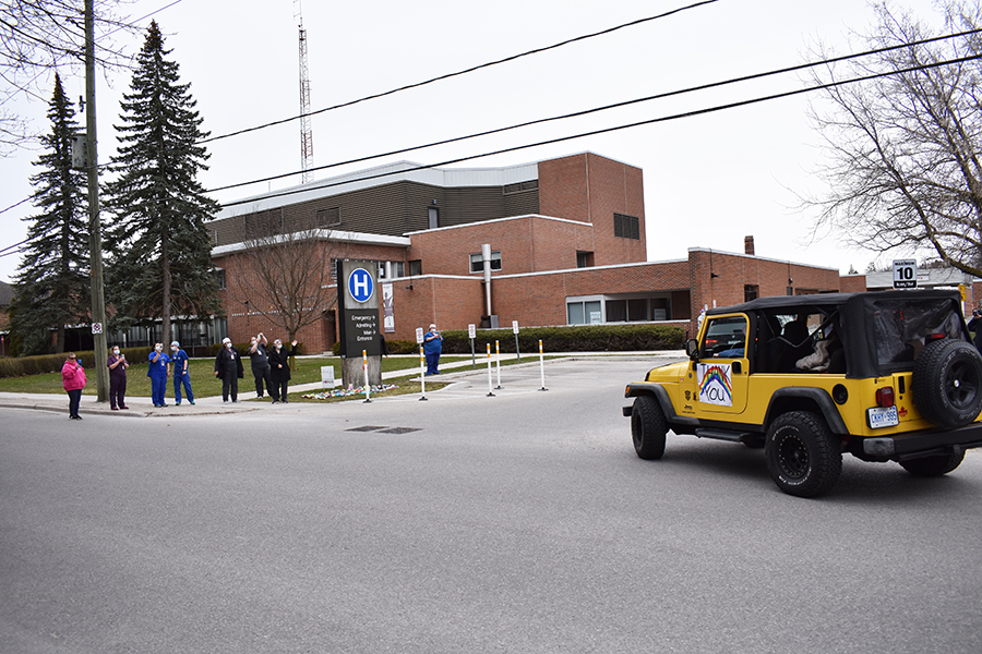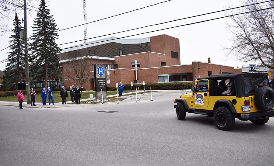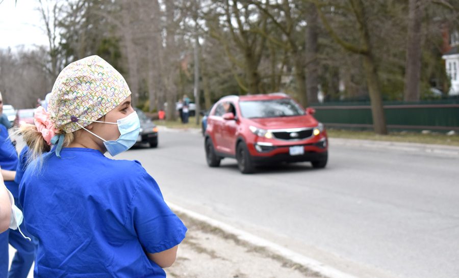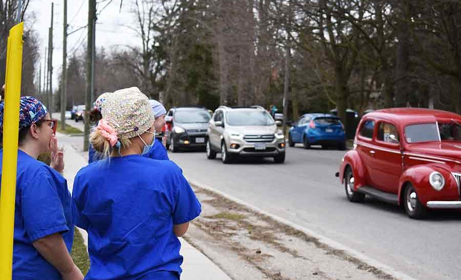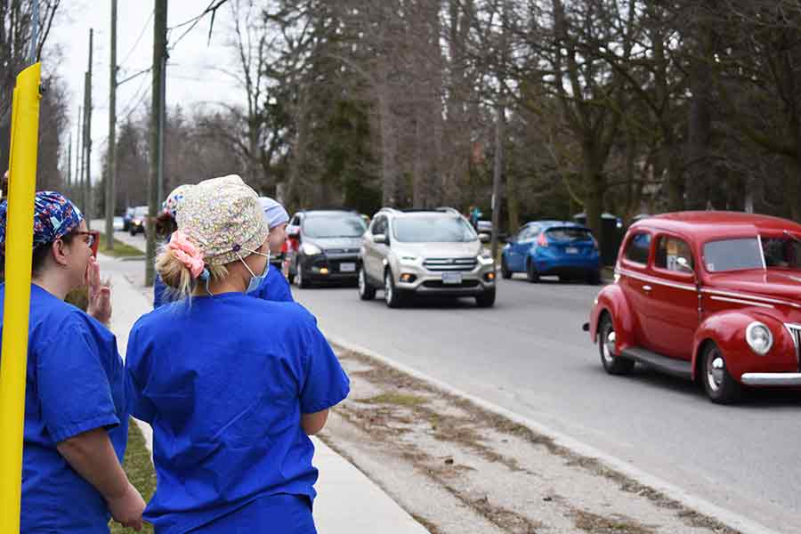 Car rally – Frontline health care workers stood outside Groves hospital on April 26 as about 100 vehicles passed by displaying messages of support and gratitude. The car rally wove its way through Centre Wellington, acknowledging workers at various stops, including Caressant Care Fergus, Highland Manor, Guelph-Wellington Emergency Services, the Wellington County OPP, Wellington Terrace in Aboyne and the Elora fire station.